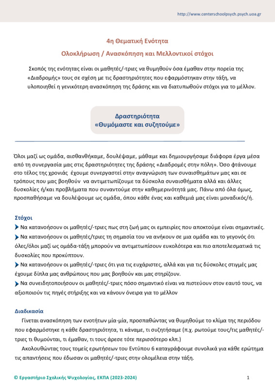 4η Θεματική Ενότητα- Ολοκλήρωση / Ανασκόπηση και Μελλοντικοί στόχοι